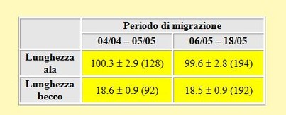 Dalla tabella si evidenzia una chiara presenza di uccelli con ali più lunghe nella prima parte della migrazione rispetto a quelli catturati nel secondo periodo, cioè dopo il 5 Maggio. Le differenze tra le lunghezze alari calcolate nei due periodi sono state altamente significative. Al contrario, non sono state trovate differenze per quanto riguarda le medie della lunghezza del becco calcolate prima e dopo il 5 Maggio. I nostri risultati sono discordanti rispetto a quanto riportato da Chernichko et al. (1993) per il Sivash. In effetti questi autori hanno trovato nella seconda metà di Maggio uccelli con l'ala più lunga ma con becco più corto. Purtroppo non è chiaro se queste differenze vanno imputate a differenze tra sessi oppure, più probabilmente, a differenze geografiche dovute a popolazioni più orientali che passano prima.